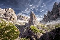 Torenhoge rotspieken steken dramatisch af tegen een lucht vol wolken. Zonlicht benadrukt de verschillende texturen van het ruige landschap.