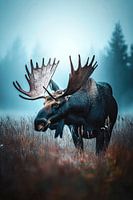 Te midden van een in mist gehuld wildernispanorama rijst een indrukwekkende eland majestueus op, met zijn statige gewei als een natuurlijk kroonornament. De zachte aardetinten van het mos en de grassen omlijsten zijn imposante aanwezigheid, terwijl de mysterieuze sfeer van de omgeving een gevoel van stille grootsheid uitstraalt.