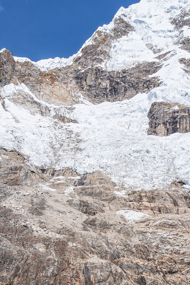 Dit kunstwerk toont de dramatische schoonheid van een besneeuwde bergtop die uitsteekt boven lagen ruige, getextureerde rotsen. Het opvallende contrast tussen de ijskoude witte gletsjer en de aardetinten van de berg zorgt voor een fascinerend beeld. Bij nadere inspectie komen ingewikkelde details naar voren, zoals de patronen die in de rotsen zijn geëtst, de talloze kleine watervallen en stroompjes die van de gletsjer naar beneden storten en zich een weg banen door de stenen terwijl ze smeltwater naar beneden voeren.