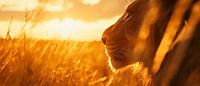 De majestueuze leeuw troont in het felle zonlicht, zijn manen wapperen zachtjes in de wind en zijn blik is vol wijsheid en kracht. Omringd door gouden grassen straalt het beeld een sfeer van wildheid en vrijheid uit. Ideaal voor in de woonkamer om een aangrijpende band met de natuur en een rustgevende aanwezigheid te creëren.