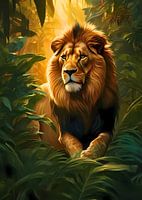 Een majestueuze leeuw met een dikke, gouden manen staat te midden van weelderig groen gebladerte. De leeuw's doordringende amberkleurige ogen staren aandachtig naar voren, zijn krachtige lichaam gedeeltelijk verborgen door de dichte begroeiing. Warm zonlicht filtert door de bladeren en werpt een gouden gloed op het tafereel. De leeuw's aanwezigheid straalt kracht en autoriteit uit en creëert een gevoel van ontzag en verwondering.