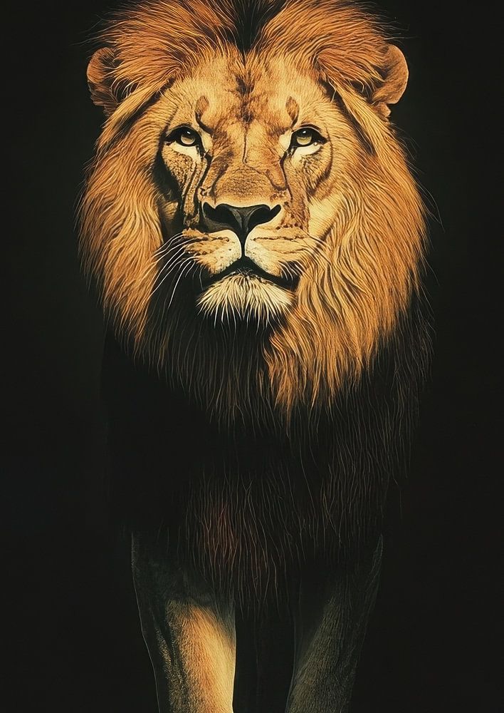 Een majestueuze leeuw staat krachtig in de duisternis, zachtjes verlicht van boven. De donkere, lege achtergrond benadrukt zijn opvallende silhouet en vloeiende manen. Zijn stralende ogen staren intens en zelfverzekerd terwijl hij troont op sterke poten. Dit schilderij vangt de pure kracht, elegantie en schoonheid van het wild en belichaamt de majesteit van de natuur. Een indrukwekkend kunstwerk vol gratie en kracht.