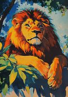 Een majestueuze leeuw zit ontspannen in de Afrikaanse savanne, vastgelegd in een kleurrijk portret in de stijl van Henri Matisse. Grote penseelstreken en gedurfde kleurvlakken domineren het schilderij, dat speelt met levendig blauw, groen en warme aardetinten. Duidelijke lijnen en een sterk contrast tussen licht en donker geven het schilderij levendigheid en diepte. De leeuw kijkt de kijker zelfverzekerd en vriendelijk aan, ingebed in een natuurlijke omgeving onder een helderblauwe lucht met groene bladeren. Een kunstwerk vol levensvreugde en warmte.