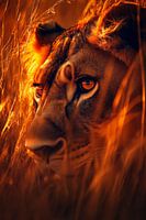 In een gouden lichtstraal staart het majestueuze dier met doordringende ogen uit het hoge gras, alsof het mysterieuze verhalen uit de wildernis wil vertellen. Deze krachtige aanwezigheid brengt een dynamische energie in elke woonkamer en trekt de aandacht terwijl het een rustgevende, natuurlijke sfeer creëert.