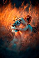 De majestueuze leeuwin komt tot leven in het zachte licht van de schemering, haar blik vol gratie en kracht. De warme, heldere kleuren van de achtergrond geven het beeld een spannende dynamiek. Perfect voor in de woonkamer, waar het een gevoel van avontuur en wildernis uitstraalt en het trotse middelpunt van elk gesprek zal zijn.