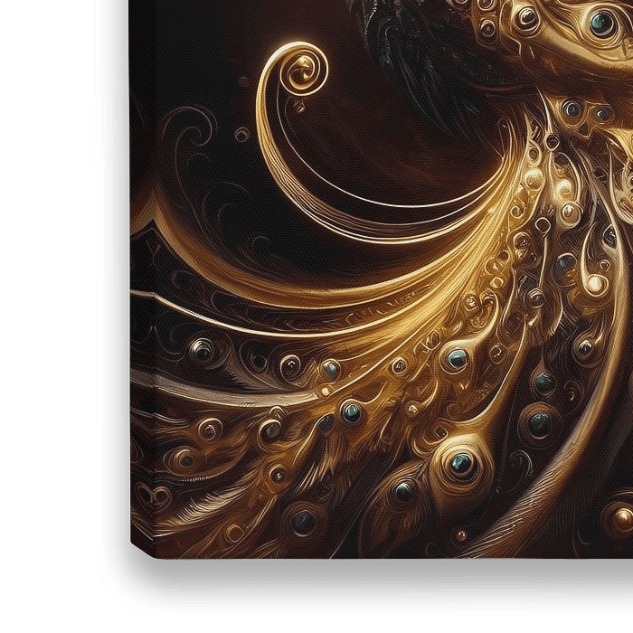 Dit indrukwekkende kunstschilderij toont een prachtige pauw in glinsterend goud. De majestueuze veren spreiden zich uit in een sierlijk patroon dat de elegantie en grandeur van de pauw benadrukt. Het gouden kleurenpalet geeft het schilderij een luxueuze en verfijnde uitstraling, perfect om een stijlvolle en stralende sfeer toe te voegen aan elke kamer.