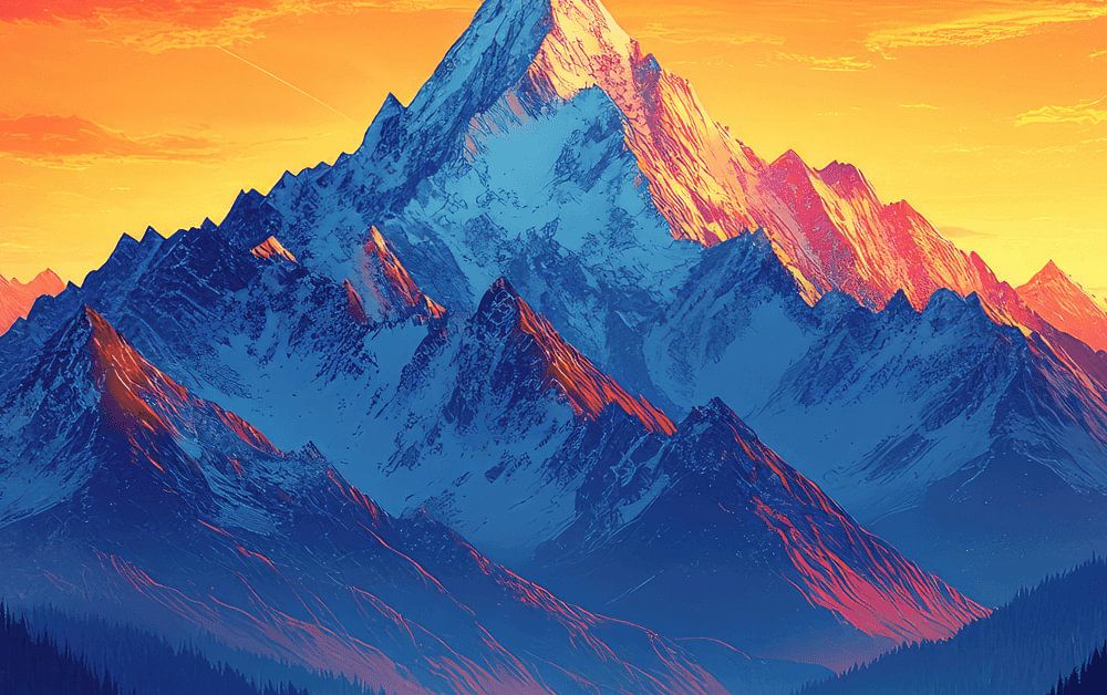 Een prachtige illustratie van bergen met besneeuwde toppen die worden verlicht door de warme tinten van een levendige zonsopgang. Lagen van mistige blauwe bossen voegen diepte toe, terwijl de vurige oranje lucht de adembenemende schoonheid van de natuur versterkt. Perfect voor fans van serene landschappen en sfeervolle kunst.