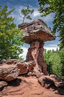 Een grote rotsformatie staat prominent met een enkele boom erop. Omringd door weelderig groen laat het tafereel de schoonheid van de natuur zien.