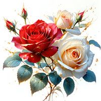 Het kunstwerk ontvouwt een indrukwekkend eerbetoon aan de koningin der bloemen - de roos - en nodigt de kijker uit om te genieten van haar tijdloze schoonheid. Het werk, dat is opgesteld als individuele compositie of in een harmonieuze reeks van drie als drieluik, onthult een prachtig kleurenpalet: dieprode rozen met een hartstochtelijke intensiteit staan in sensuele dialoog met bloesems in delicate nuances van wit tot rosé. Het gebladerte, in geraffineerd blauwgroen, zorgt voor een koel maar contrasterend accent dat de bloemenpracht nog levendiger maakt.