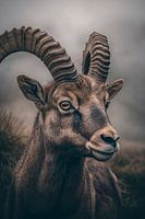 Met majestueuze, gedraaide horens siert een indrukwekkend dier het tafereel, zijn ogen stralen kalmte en vastberadenheid uit. Omringd door zachte mist, belichaamt dit wezen de kracht van de natuur en betovert het de kijker met zijn buitengewone aanwezigheid. Een werkelijk fascinerend schouwspel in de wildernis.