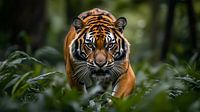 Deze prachtige foto toont een majestueuze tijger sluipend door zijn weelderige, groene jungle. De intense focus en krachtige aanwezigheid van de tijger worden prachtig weergegeven en vertegenwoordigen de essentie van wilde schoonheid en kracht. Deze foto is perfect voor liefhebbers van wilde dieren en natuurliefhebbers en brengt de ongetemde geest van de jungle levendig in beeld.