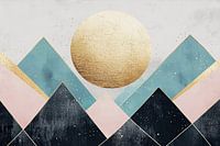 Abstracte geometrische vormen met goudfolie en pastelkleuren tegen een zwarte achtergrond. Een gouden zon schijnt over de bergen, met roze, blauwe, groene en witte kleurtinten.