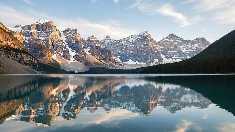 Dit kunstwerk toont een adembenemend berglandschap dat perfect wordt weerspiegeld in een kalm, kristalhelder meer. Torenhoge besneeuwde toppen steken dramatisch af tegen een zachtblauwe lucht, terwijl warm zonlicht de ruige rotsformaties zachtjes benadrukt. De spiegelachtige reflectie op het water creëert een gevoel van evenwicht en…