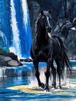 Majestueuze zwarte hengst bij de waterval van A.D. Digital ART