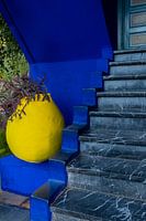 Blauwe huis van Yves Saint Laurent met gele vaas in museum Jardin Majorelle in Marrakech, Marokko.
