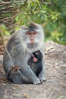 Deze aap had als enigste al een jong bij zich. Een aantal andere apen waren nog zwanger en waren duidelijk wat minder actief. Foto gemaakt in Bali.