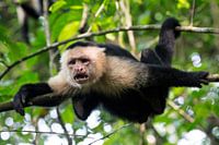 Een makaak verdedigd zijn territorium in de jungle van het Corcovado nationaal park door zijn tanden te tonen. Corcovado ligt op de Osa peninsula in het zuiden van Costa Rica.