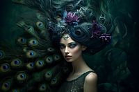 Een afbeelding van een vrouw, visagie, prachtige make-up en omgeven door pauwenveren.