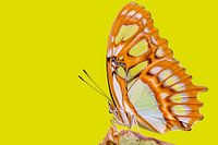Deze oranje/gele vlinder is een malachietvlinder , Siproeta stelenes , afgebeeld op een gele achtergrond