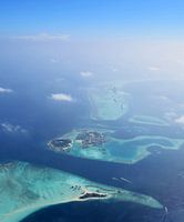 Luchtfoto van een paar tropische eilandjes in een atol in de Malediven met lagunes in prachtig turquoise tinten.