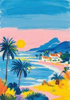 Een gouache schilderij toont een vogelperspectief van de kust van Malibu, Californië. Palmbomen en strandhuisjes staan op gouden zandstranden terwijl de zon ondergaat achter blauwe bergen. Het kleurenpalet combineert zachte pastels met levendige accenten, waardoor een harmonieuze, retro-geïnspireerde sfeer ontstaat in de stijl van mid-century moderne reisposters. De sobere, minimalistische compositie benadrukt het landschap, de gebouwen en palmbomen, terwijl de witte achtergrond de scène duidelijk isoleert. Het werk combineert nostalgische esthetiek met moderne gouache-techniek, levendige kleuren en een gestileerde weergave van het kustlandschap.