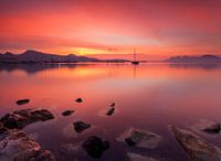 Mallorca, Spanje bij zonsopgang. Dit is de jachthaven van Port Pollença, een prachtige haven in het noorden van het Balearische eiland in de Middellandse Zee. Mallorca is heel toeristisch, vooral het zuiden is heel populair, maar het noorden is veel rustiger, ruiger en wat mij betreft mooier.