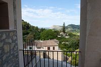 Uitzicht vanuit het raam op het Mallorcaanse landschap.