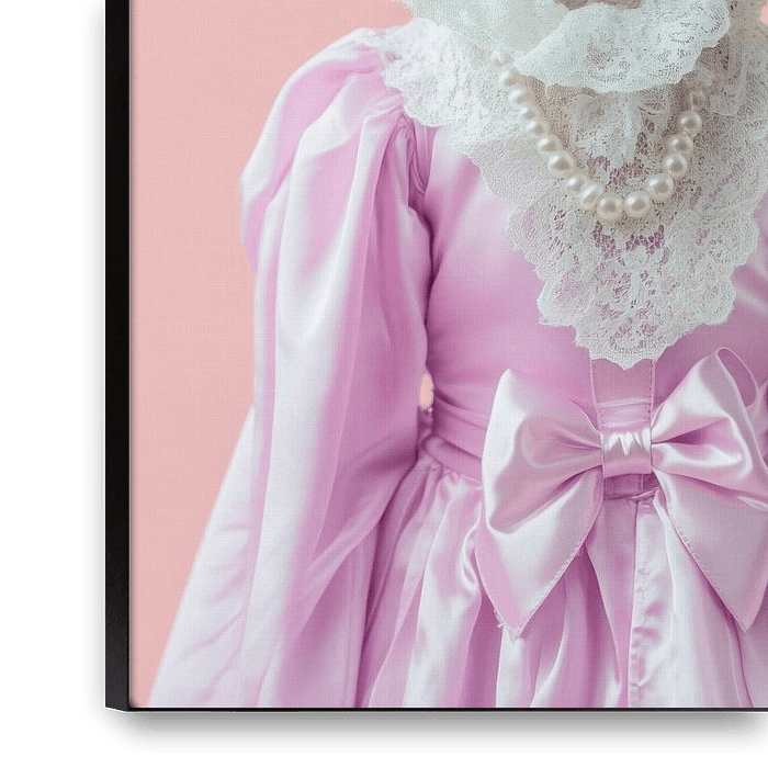 Een verlegen aristocrate in harige vorm! Met haar delicate, sneeuwwitte vacht en grote, levendige ogen betovert ze elke toeschouwer. Ze draagt een prachtige paarse jurk en een elegante parelketting en straalt een charmante glamour uit die doet denken aan koninklijke tijden. Een echt koninklijk wezen dat harten verovert!