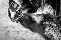 Dit werk is een zwartwit portret foto van een veulen met zijn moeder. Dit veulen was een week oud toen ik hem fotografeerde. Hij wilde duidelijk aandacht van zijn moeder.