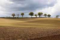De zon die over de glooiende velden bij Mamelis schijnt (Heuvelland, Zuid-Limburg).