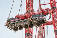 Deze foto is gemaakt op 6 april 2024 tijdens de open dag van Mammoet in Schiedam. Deze GROVE mobiele kraan, met een gewicht van 60 ton, hangt in de lucht in de hijskabels van de gigantische PTC 210-DS kraan van Mammoet.