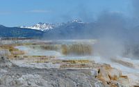 Mammoth Hot Spring Terraces in Yellowstone national park USA. Op de achtergrond zijn de sneeuwtoppen van de bergen nog zichtbaar. De aanblik van koude sneeuw vormt een vreemd contrast met de stoom van de warmwaterbron. De terrassen veranderen steeds van vorm en kleur. Bronnen nu nog actief kunnen over een aantal jaren levenloos en droog…