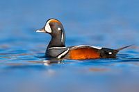 Prachtig mannetje Harlekijneend (Histrionicus histrionicus) zwemmend op een blauw gekleurd meer in IJsland. Fantastisch mooi eendensoort