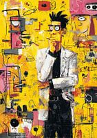 Man Jasje | Thinker - Dit is een schilderij van een man in een wit jasje die met een bezorgde uitdrukking zijn hand aan zijn kin houdt, tegen een felgele achtergrond vol abstracte vormen en kleuren die de aandacht trekken.