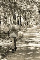 De man loopt op een paadje door het bos alleen misschien best wel eenzaam.