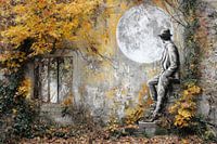 Dit urban street art schilderij van een man bij een verweerde muur onder de volle maan in warme herfstkleuren voelt dromerig en poëtisch aan en geeft karakter aan je interieur. Het roept stilte, verwondering en melancholie op en voegt een verhaal toe aan de ruimte.