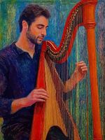 Een man zit voor een grote harp, zijn handen tokkelen zachtjes op de gouden snaren. Het schilderij straalt rust en adel uit, met zacht wit en zacht groen dat opgaat in een heldere achtergrond. Zijn geconcentreerde houding weerspiegelt discipline en vrede, terwijl de vloeiende bogen van de harp het oog meevoeren in een rustig ritme van vorm en harmonie.