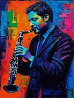 Dit opvallende schilderij toont een man in stille concentratie, waarbij de klarinet uit zijn handen rijst als een verlengstuk van zijn geest. Koele blauwtinten en rokerige grijstinten omringen hem en suggereren een jazzbar verloren in de tijd of de echo van een optreden in de schemering. Zijn uitdrukking is intens, meditatief, volledig verbonden met elke ademhaling en noot. Het penseelwerk bootst geluidsgolven en gesyncopeerd ritme na, wat energie en diepte geeft aan de compositie. Of het nu voor muziekliefhebbers is of voor mensen die de jazzcultuur bewonderen, dit kunstwerk maakt een statement - een statement van discipline, creativiteit en de taal van muziek zonder woorden.