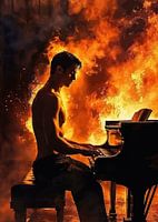 Badend in een vlammend abstract vuur zit een shirtloze man aan een vleugel, zijn figuur verlicht door golven van flikkerend karmozijnrood en goud. Spieren gespannen in een gerichte beweging, wordt hij één met het instrument - elke toetsaanslag stuurt vonken door de lucht alsof de muziek zelf in vlammen is gesmeed. De piano lijkt te versmelten in het vuur, zijn vorm half echt, half droom, symbool voor de passie en intensiteit van pure artistieke expressie. Deze surrealistische compositie vervaagt de grens tussen geluid en vlam, mens en muziek.