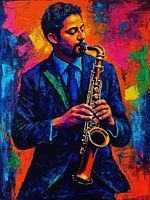 Dit opvallende schilderij toont een man in stille concentratie, waarbij de klarinet uit zijn handen rijst als een verlengstuk van zijn geest. Koele blauwtinten en rokerige grijstinten omringen hem en suggereren een jazzbar verloren in de tijd of de echo van een optreden in de schemering. Zijn uitdrukking is intens, meditatief, volledig verbonden met elke ademhaling en noot. Het penseelwerk bootst geluidsgolven en gesyncopeerd ritme na, wat energie en diepte geeft aan de compositie. Of het nu voor muziekliefhebbers is of voor mensen die de jazzcultuur bewonderen, dit kunstwerk maakt een statement - een statement van discipline, creativiteit en de taal van muziek zonder woorden.