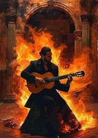 Een eenzame man zit in stille intensiteit en wiegt een klassieke gitaar terwijl vlammen van abstract vuur om hem heen dwarrelen. De vurige energie verbrandt niet - ze danst, verlicht zijn geconcentreerde uitdrukking en tekent zijn silhouet in gesmolten tinten. Zijn zittende houding geeft blijk van kalme controle te midden van de chaos, waarbij elke tokkel van de snaren zichtbare geluidsgolven door het inferno van kleur stuurt. Dit is niet zomaar een optreden, het is een gemeenschap, een ziel die passie kanaliseert door middel van snaren in een vurige mijmering.