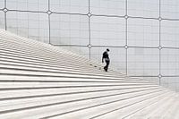 Je ziet een man die via trappen naar beneden loopt. Door een standpunt te kiezen aan de zijkant van de trappen zie je de lange lijnen van de trappen. Door het grote contrast tussen de man en de omgeving, wordt je oog meteen getrokken naar de man. De lijnen en blokken op de achtergrond zijn een mooie tegenhanger van de richting van de lijnen van de trappen.