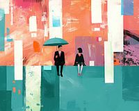 Man en Meisje | Abstract Schilderij met Man en Meisje - In dit abstract schilderij zie je een man met een blauwe paraplu die naast een meisje zit, terwijl een kleurrijke achtergrond van oranje, turquoise en witte vlakken de scene levendig maakt.