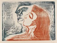 Het hoofd van een kerel en het gezicht van een meid staan op dit portret en geven elkaar een kus. Hij is in het zwart en zij in het oranje, rood.