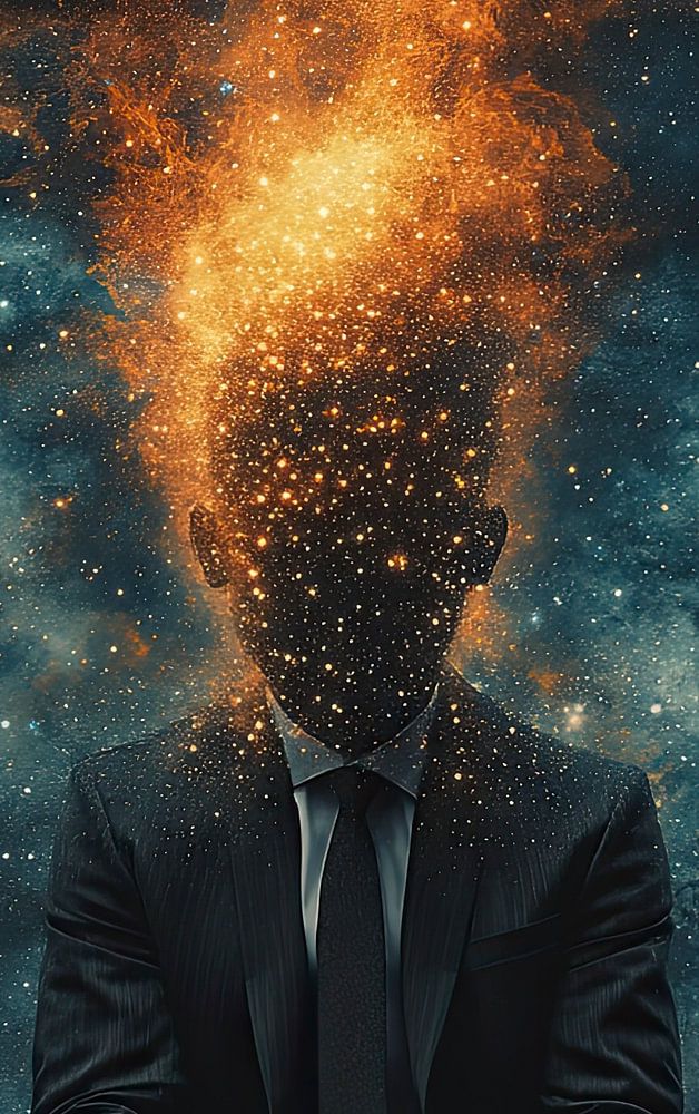 Op de afbeelding staat een man in een bruin pak met zwarte stropdas tegen een donkerblauwe sterrenhemel. Zijn hoofd en bovenlichaam worden opgeslokt door een wervelende massa oranje en geel licht, dat lijkt op een sterrenstelsel of nevel. Het licht lijkt te bestaan uit ontelbare kleine sterren en creëert een gevoel van kosmische energie en transformatie.