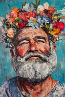 Een bebaarde man met een kroon van heldere bloemen lacht tegen een heldere turquoise achtergrond. De kleuren zijn levendig en de gezichtsuitdrukking geeft een gevoel van vreugde en tevredenheid.