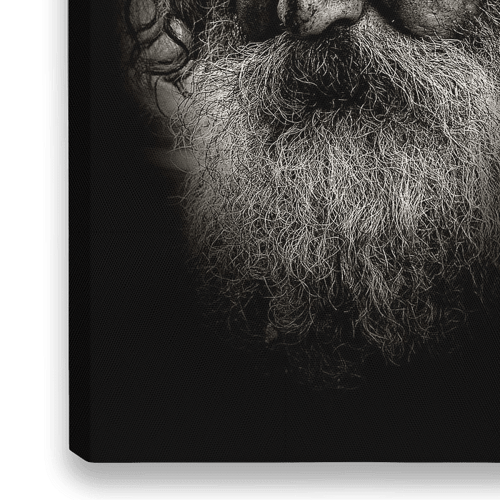 Clos-up foto, zwart-wit portretfoto van een man met een volle baard die in de camera kijkt met een karakteristiek hoofd.