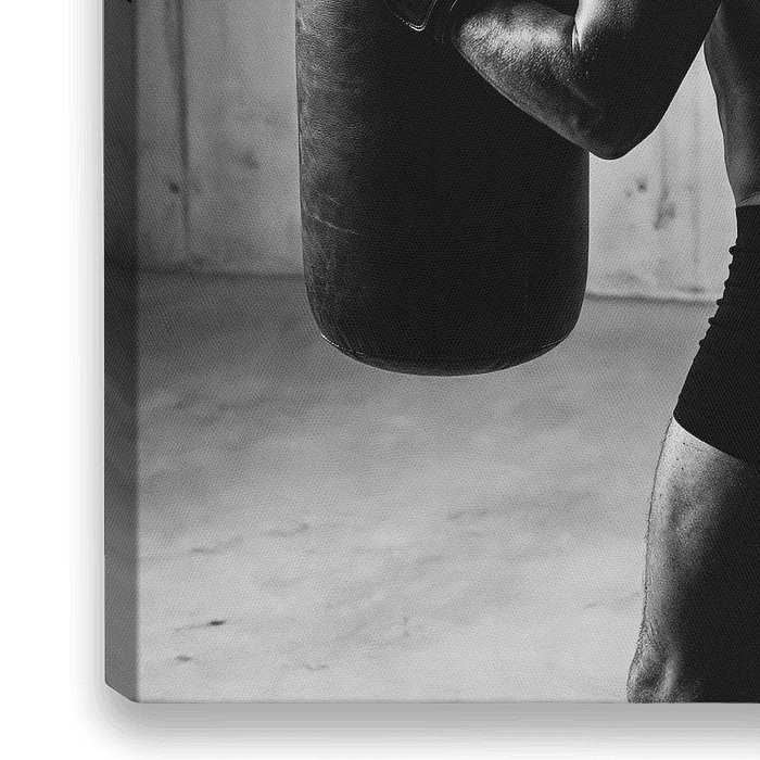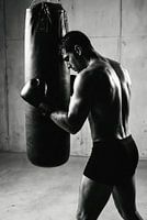 Monochroom beeld van een gespierde man die een bokszak slaat.