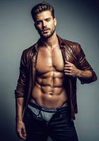 Man met gedefinieerde buikspieren die een open bruin leren shirt, grijs ondergoed en een gedeeltelijk opengeritste zwarte broek draagt, tegen een grijze achtergrond.