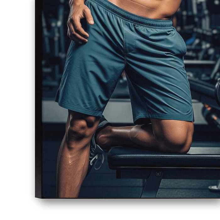 Gespierde man met halter, knielend op bank in sportschool. Donkere achtergrond van sportschool.